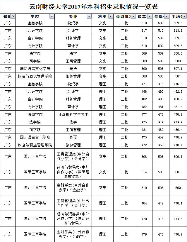 云南財(cái)經(jīng)大學(xué)2017年廣東省錄取情況一覽表