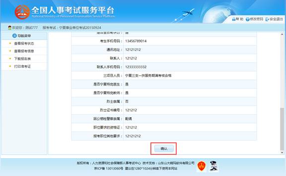 通過點擊“報名信息確認”按鈕后,跳轉(zhuǎn)到報名信息確認頁面,如下圖所示: