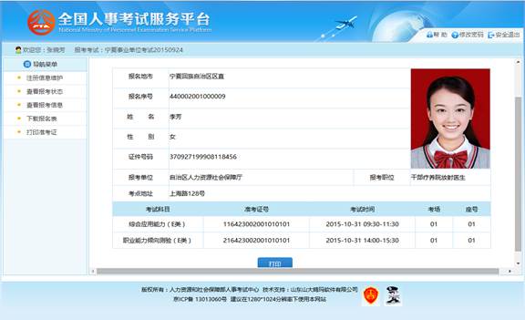 通過點擊系統(tǒng)導航菜單的“打印準考證”選項,可進入準考證打印頁面,如下