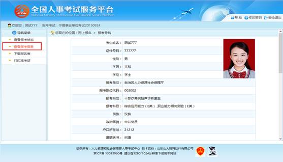 考生可以通過點擊“查看報考信息”按鈕,查看考生填寫的報考信息,如下圖所示: