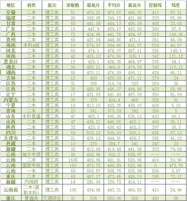 西南林業(yè)大學(xué)2017年全國各省份理工類錄取情況表