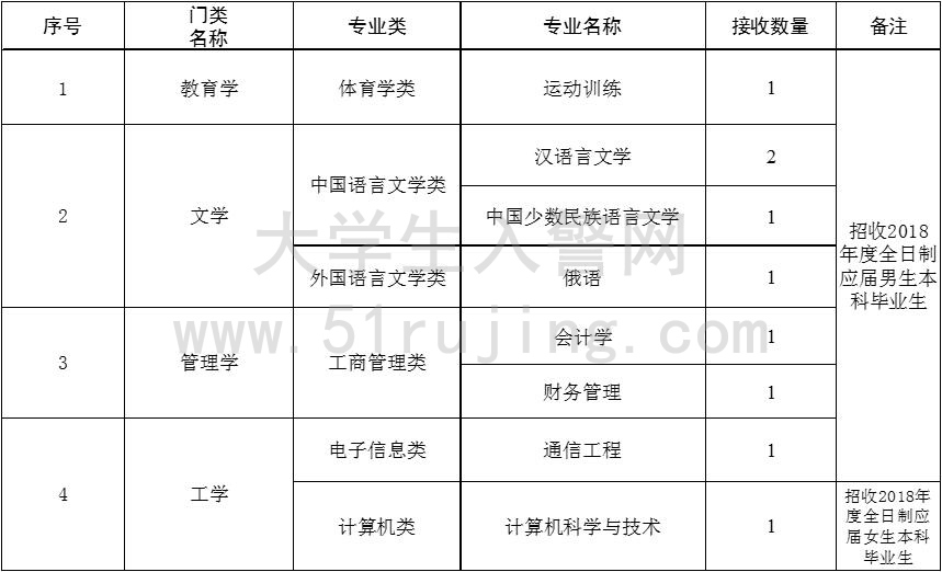 (二)文化學歷。接收對象必須是參加全國普通高等學校統(tǒng)一招生考試錄取的全日制普通高校2018年度應屆本科畢業(yè)生。重點接收國家“985”、“211”工程院校,教育部、公安部直屬院校和省屬重點高校畢業(yè)生,兼顧其它普通高校畢業(yè)生。接收對象必須按時取得畢業(yè)證書和學位證書。