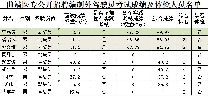 2018年曲靖醫(yī)學(xué)高等專科學(xué)校公開招聘編制外駕駛員考試成績(jī)公告