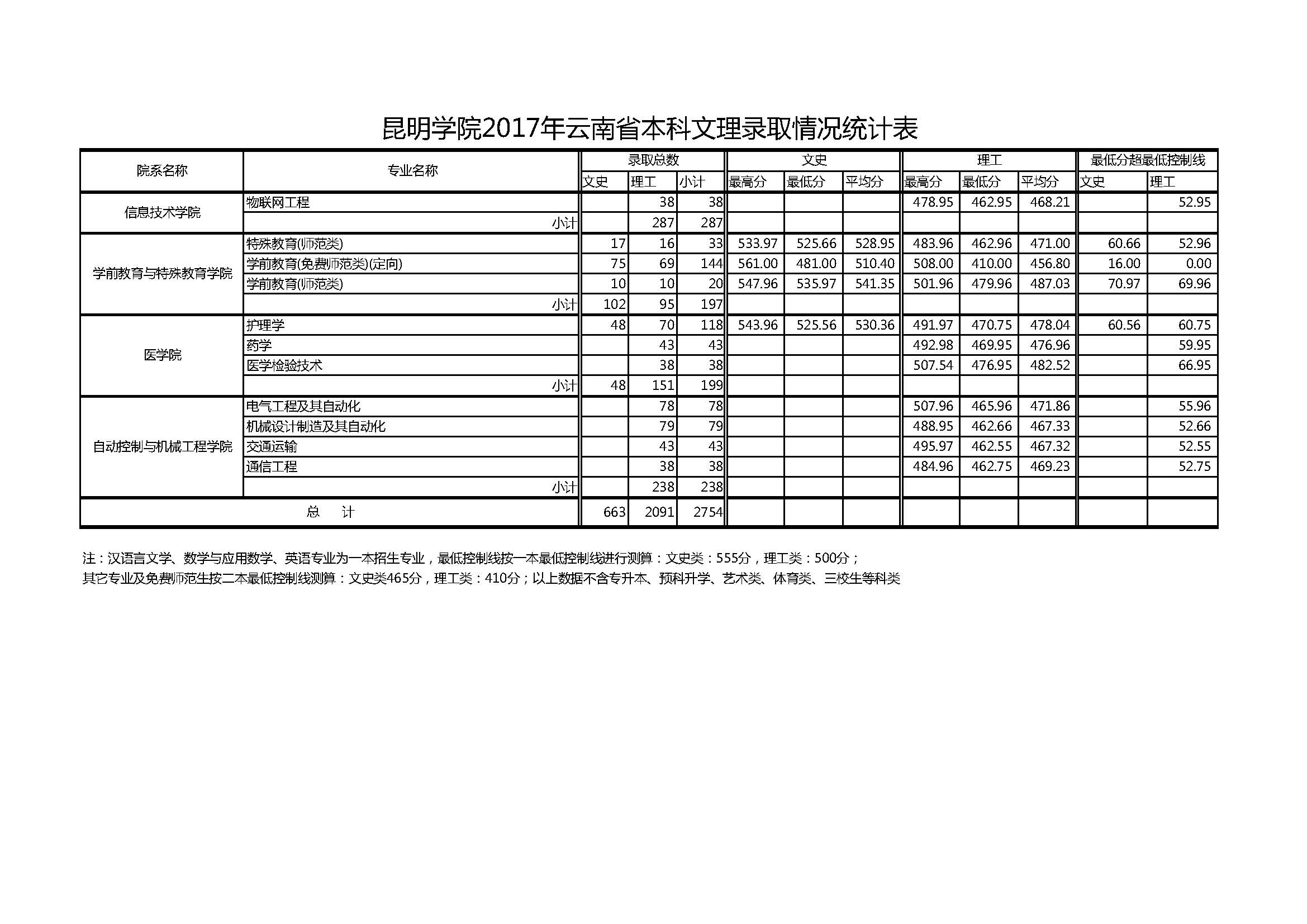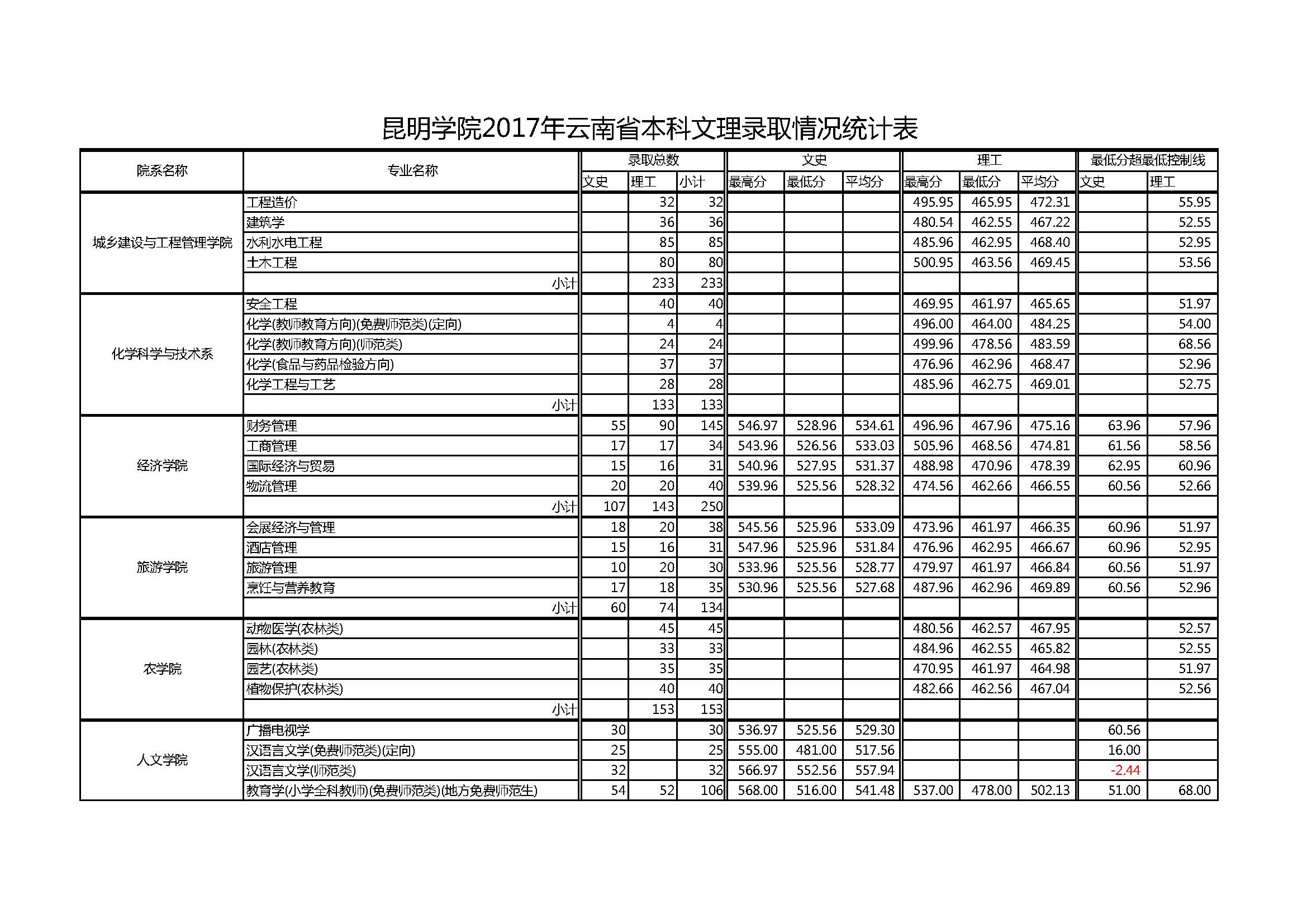 昆明學(xué)院2017年云南省本科文理錄取情況統(tǒng)計表