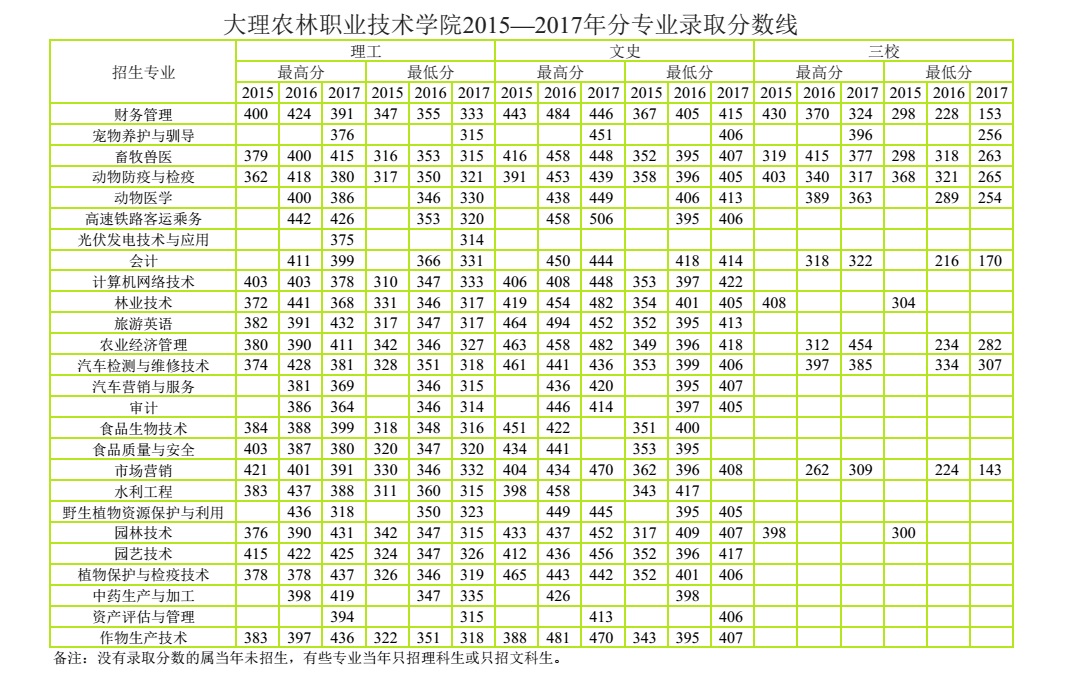 大理農(nóng)林職業(yè)技術(shù)學(xué)院2015—2017年分專業(yè)錄取分?jǐn)?shù)線