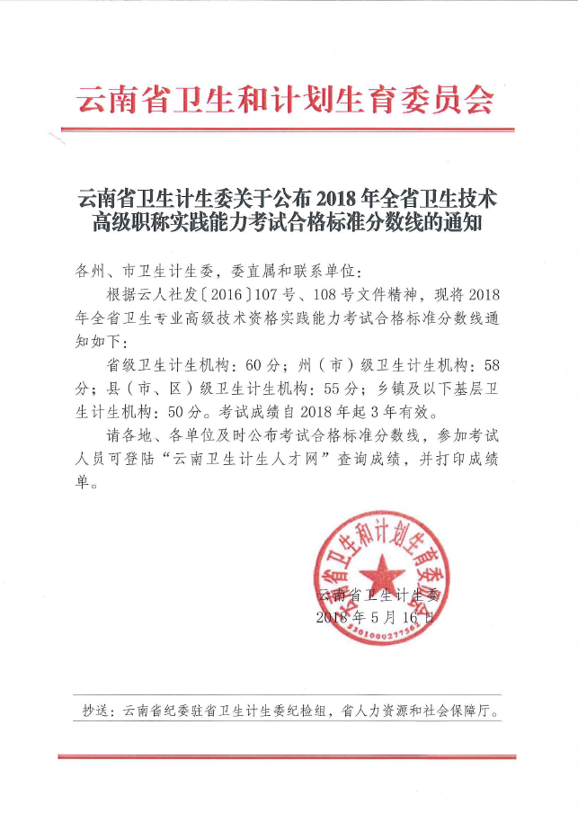 2018年云南省衛(wèi)生技術(shù)高級職稱實踐能力合格標準分數(shù)線通知