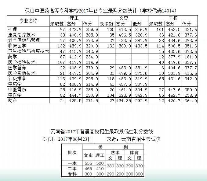 保山中醫(yī)藥高等專科學(xué)校2017年各專業(yè)錄取分?jǐn)?shù)統(tǒng)計(jì)