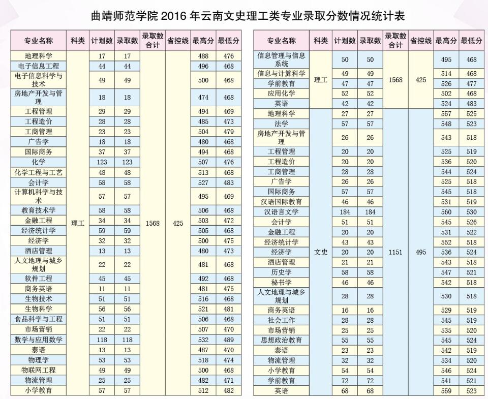 曲靖師范學院2016年云南文史理工類專業(yè)錄取分數(shù)情況統(tǒng)計表