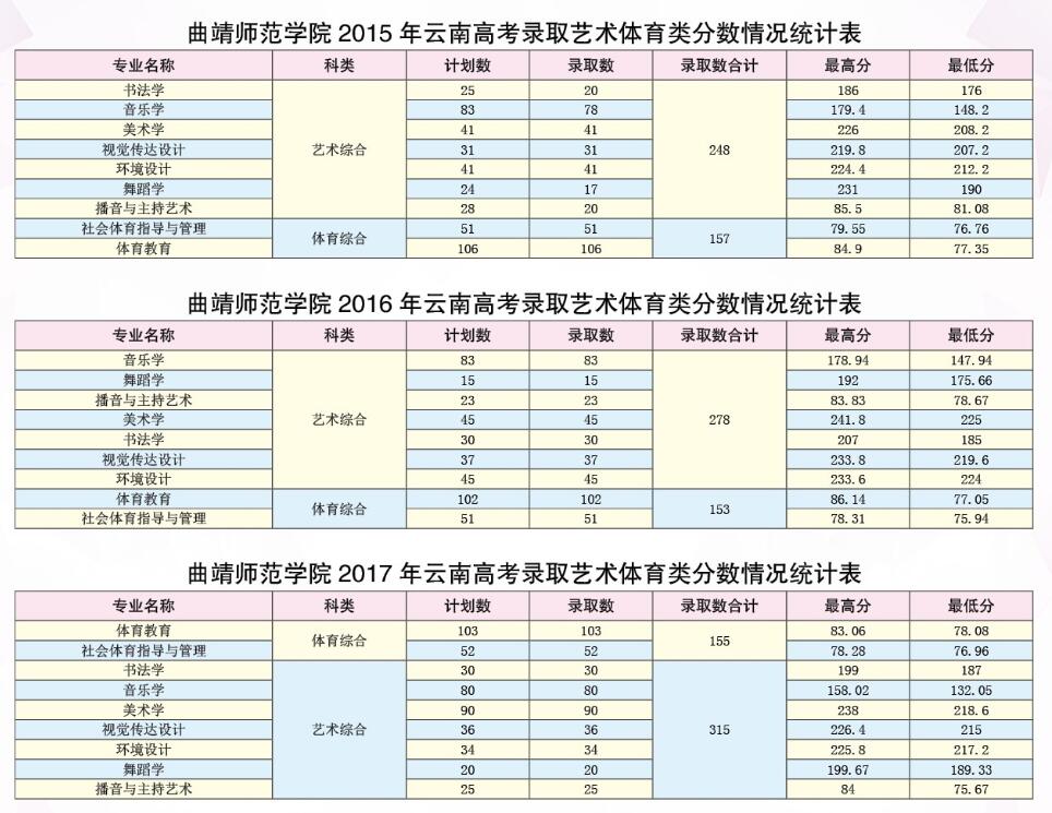 曲靖師范學(xué)院2015-2017年云南藝術(shù)體育類分?jǐn)?shù)情況統(tǒng)計(jì)表