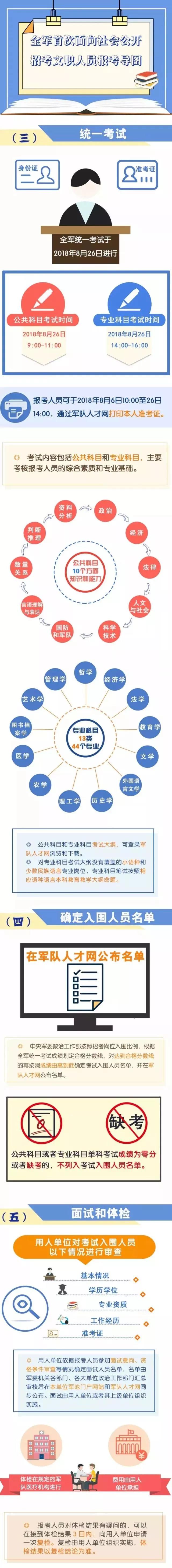 考試由全軍統(tǒng)一組織實(shí)施,在全國(guó)大中城市設(shè)置考場(chǎng),主要考核綜合素質(zhì)和專業(yè)基礎(chǔ),分為公共科目和專業(yè)科目?jī)砷T。高校畢業(yè)生和社會(huì)人才可通過(guò)軍隊(duì)專業(yè)技術(shù)人才網(wǎng)(www.81rc.mil.cn)進(jìn)行報(bào)名。