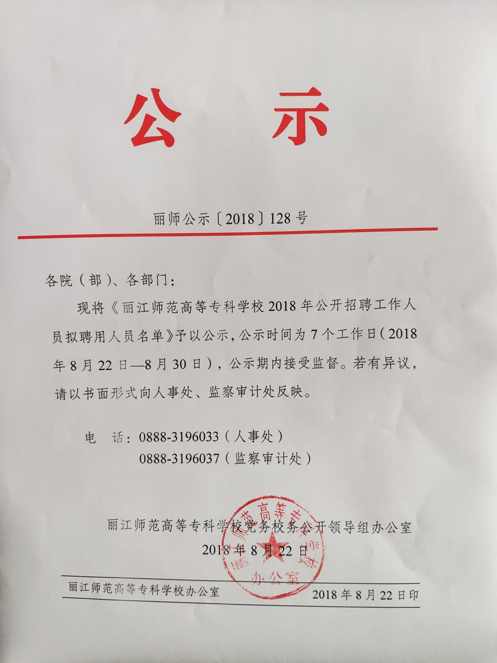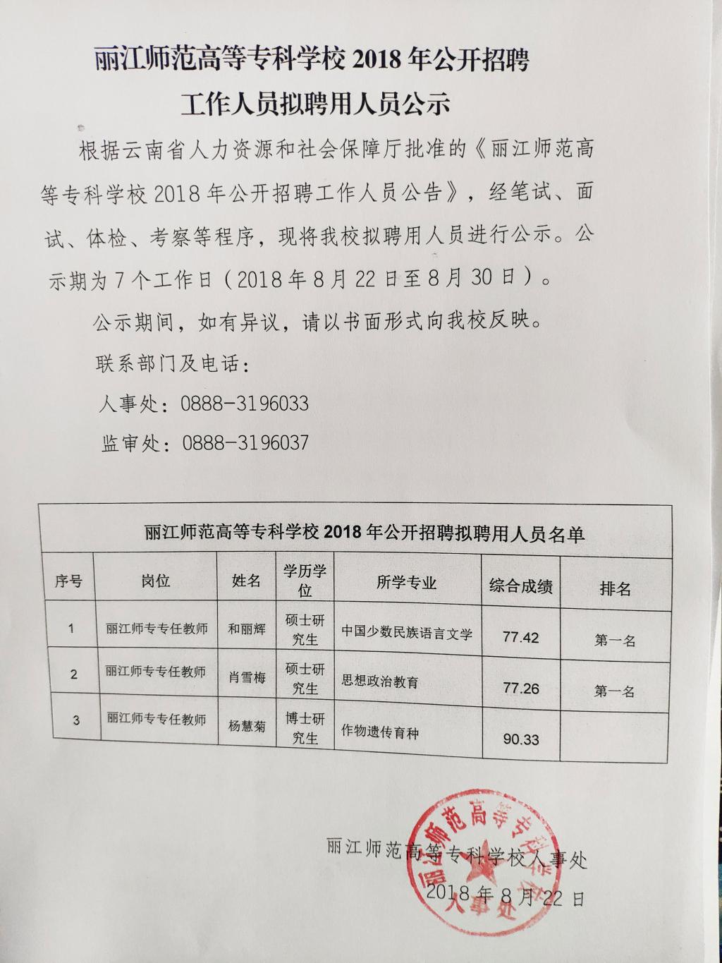 麗江師范高等專科學(xué)校2018年公開招聘工作人員擬聘用人員公示