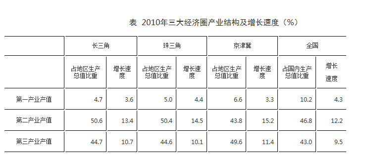 三大經(jīng)濟(jì)圈中,2010年三次產(chǎn)業(yè)增長(zhǎng)速度均超過(guò)全國(guó)平均水平的有幾個(gè)?