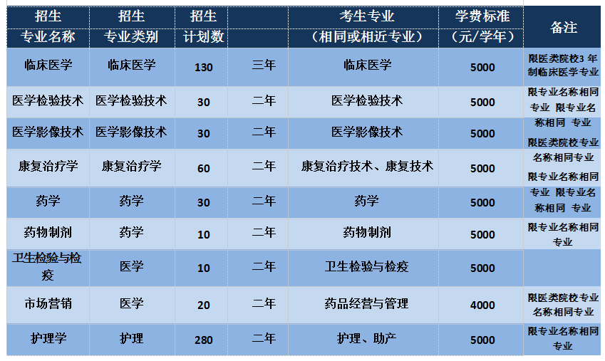 2019年我校專升本招生計(jì)劃為600名,招生專業(yè)涉及7個(gè)類別9個(gè)專業(yè),涵蓋臨床醫(yī)學(xué)類、醫(yī)學(xué)類、藥學(xué)類、護(hù)理類、醫(yī)學(xué)檢驗(yàn)技術(shù)類和醫(yī)學(xué)影像技術(shù)類。