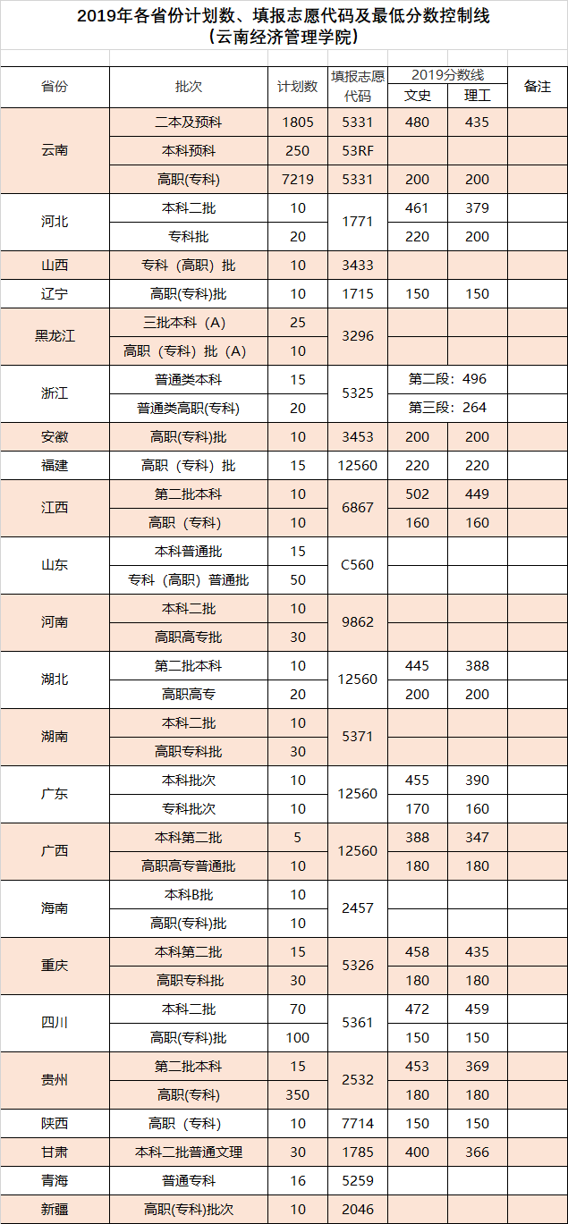 2019年云南經(jīng)濟(jì)管理學(xué)院本科各省專科