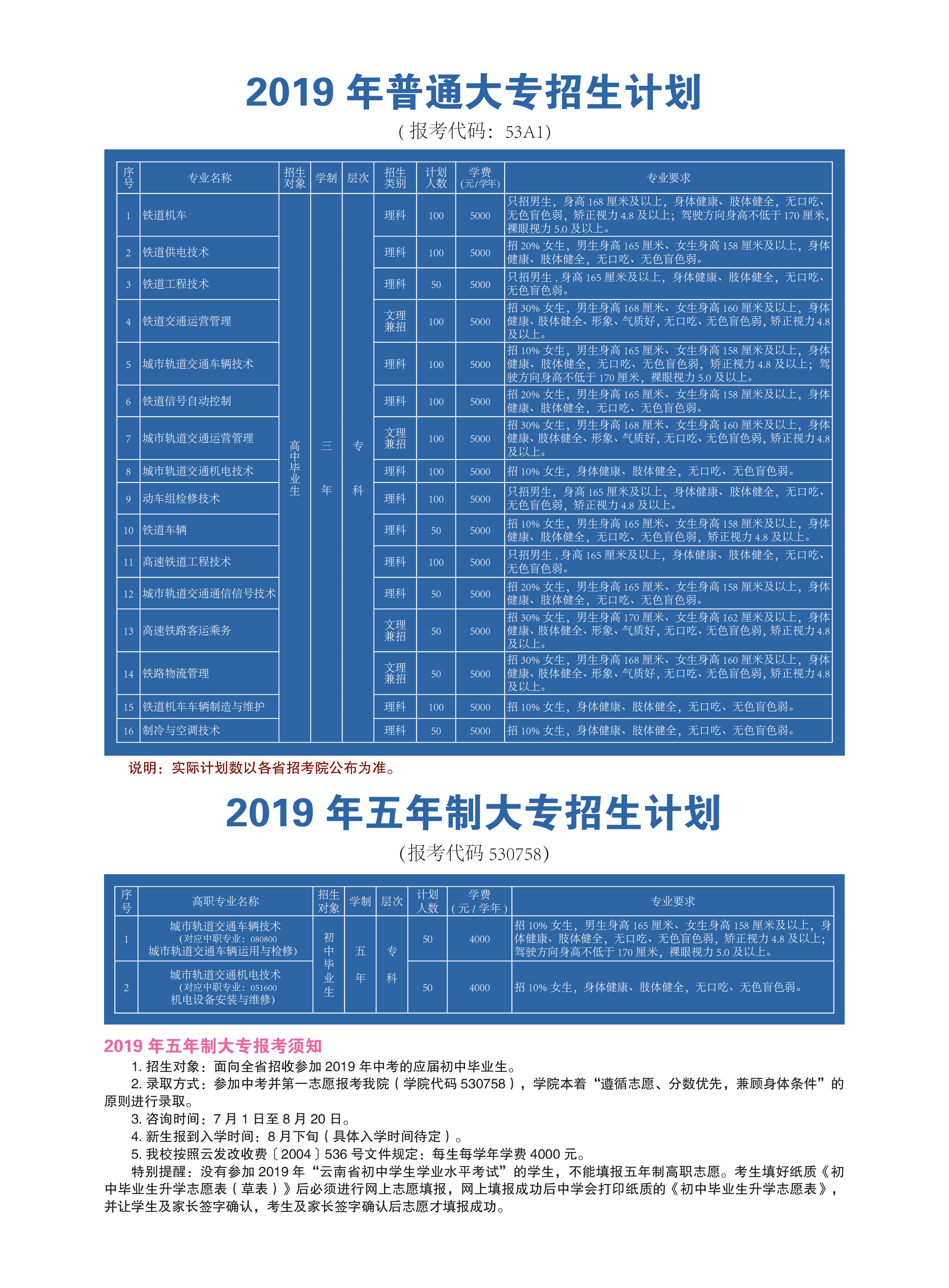 昆明鐵道職業(yè)技術(shù)學(xué)院2019年招生章程