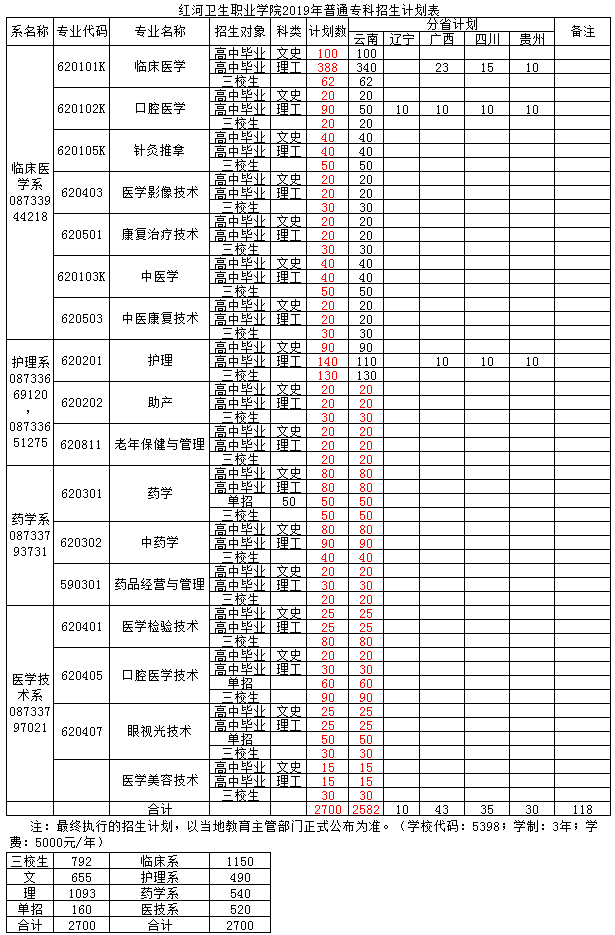 紅河衛(wèi)生職業(yè)學院2019年招生計劃