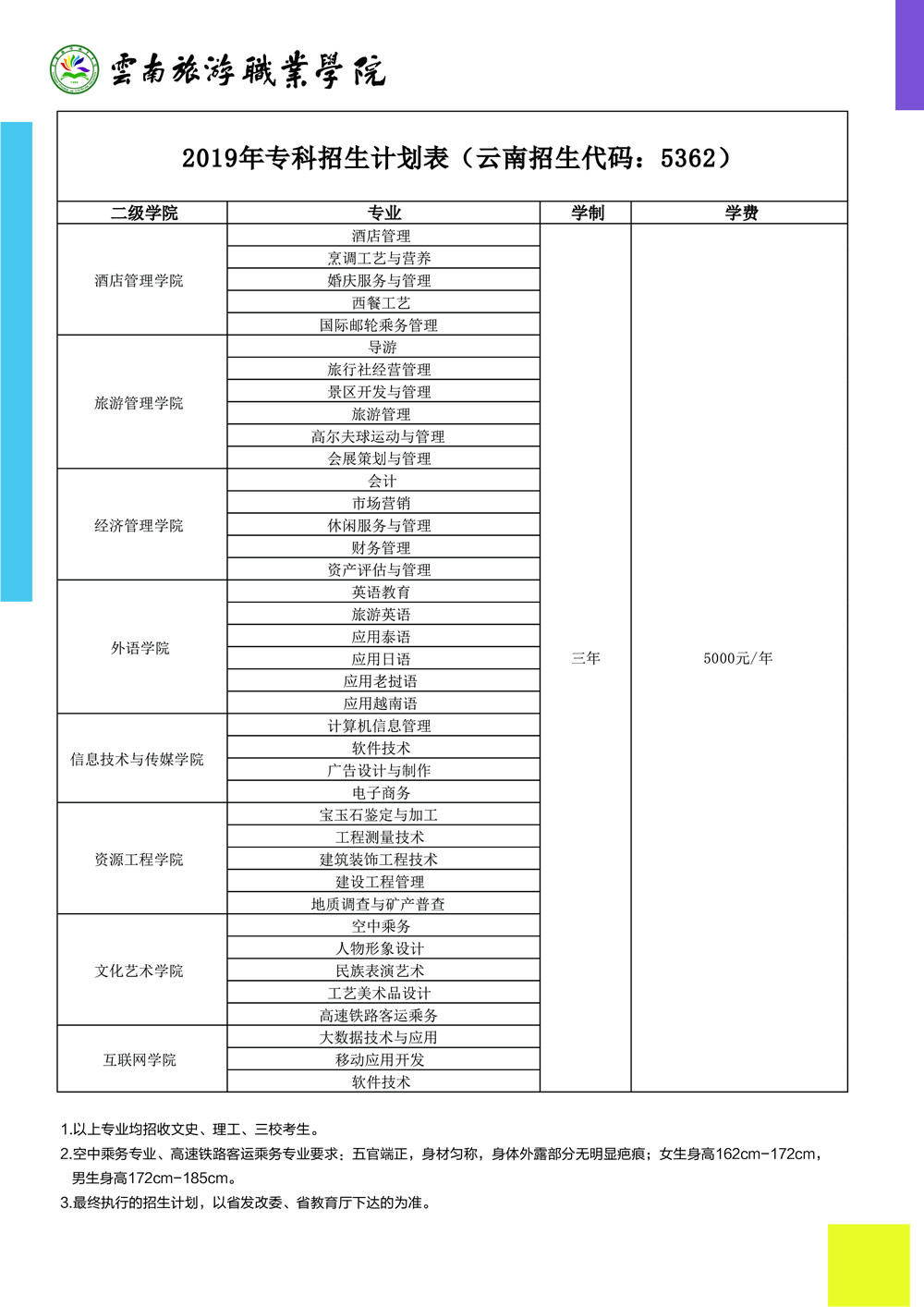 云南旅游職業(yè)學(xué)院2019年三年制專科國家招生計劃