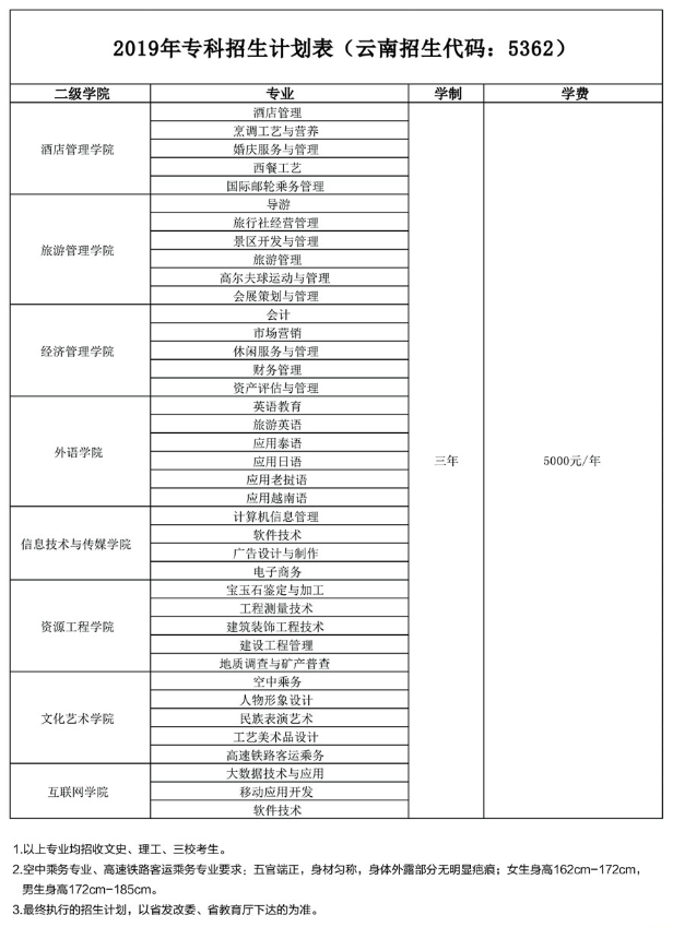 云南旅游職業(yè)學(xué)院2019年三年制??茋艺猩?jì)劃