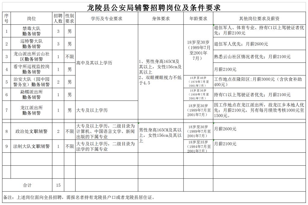 勤務(wù)輔警崗位12名、文職輔警崗位3名。