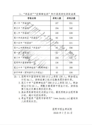 2019年昆明市普通高中錄取公告(提前批次錄取學校)