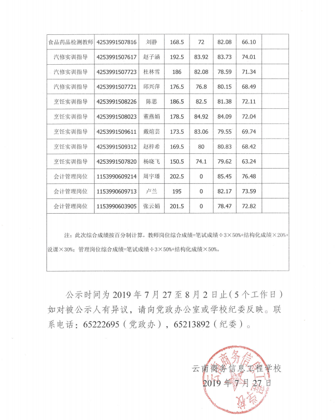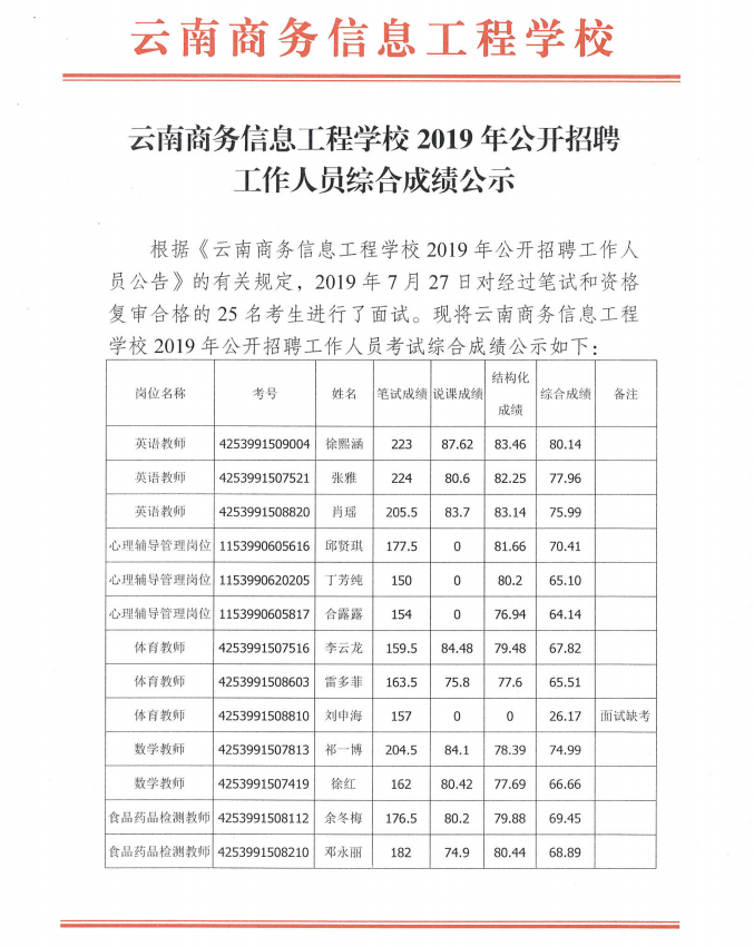 云南商務(wù)信息工程學(xué)校2019年招聘綜合成績公示