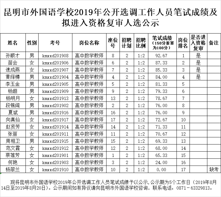 昆明市外國語學(xué)校2019年公開選調(diào)工作人員筆試成績及擬進入資格復(fù)審人選公示