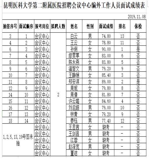 2019年11月8日醫(yī)院組成專家考核組對(duì)通過現(xiàn)場資格審核的人員進(jìn)行了面試,現(xiàn)將面試成績及進(jìn)入體檢人員名單進(jìn)行公示(成績表附后),現(xiàn)就參加體檢的具體安排通知如下:
