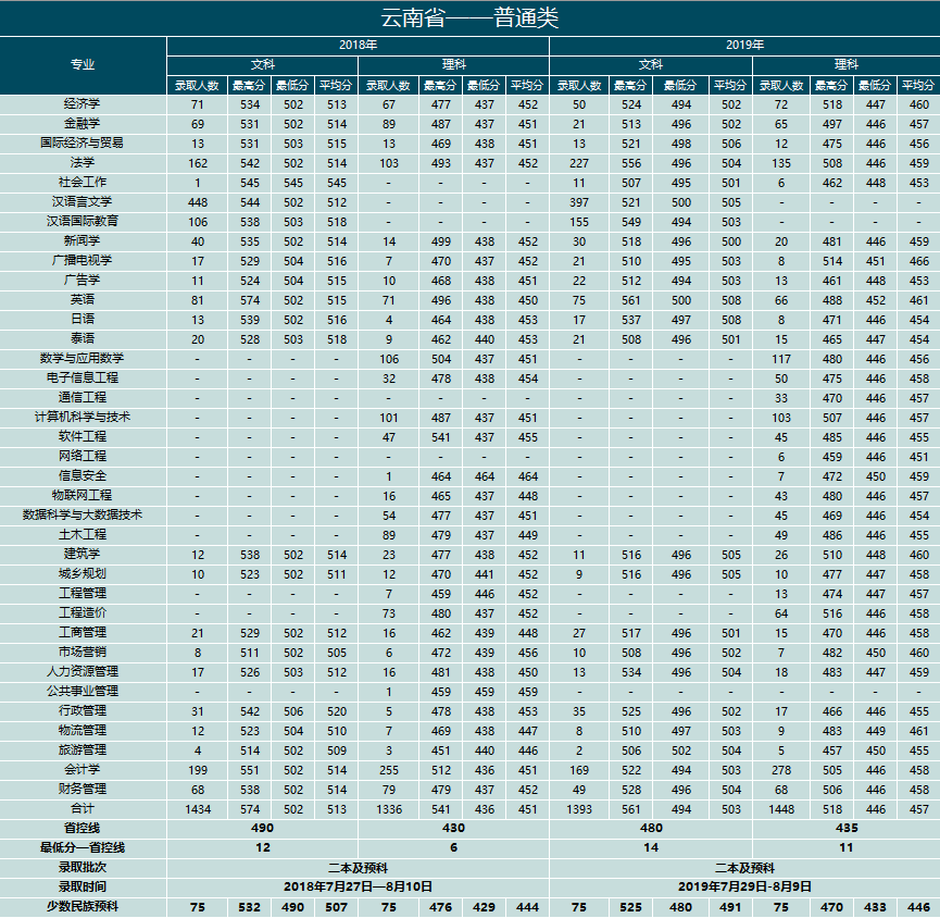 云南大學(xué)滇池學(xué)院2018、2019年云南省招生錄取情況統(tǒng)計