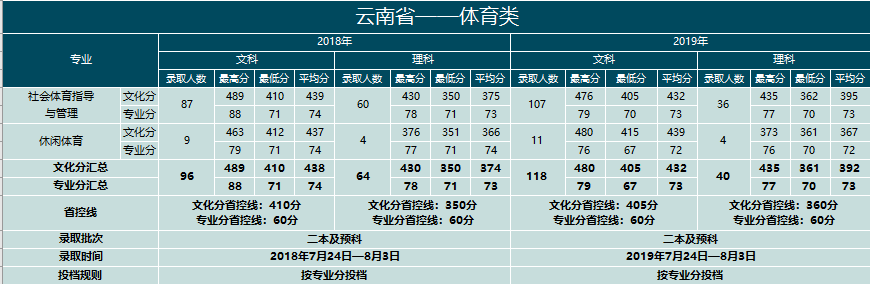 云南大學(xué)滇池學(xué)院2018、2019年外省招生錄取情況統(tǒng)計(體育類)