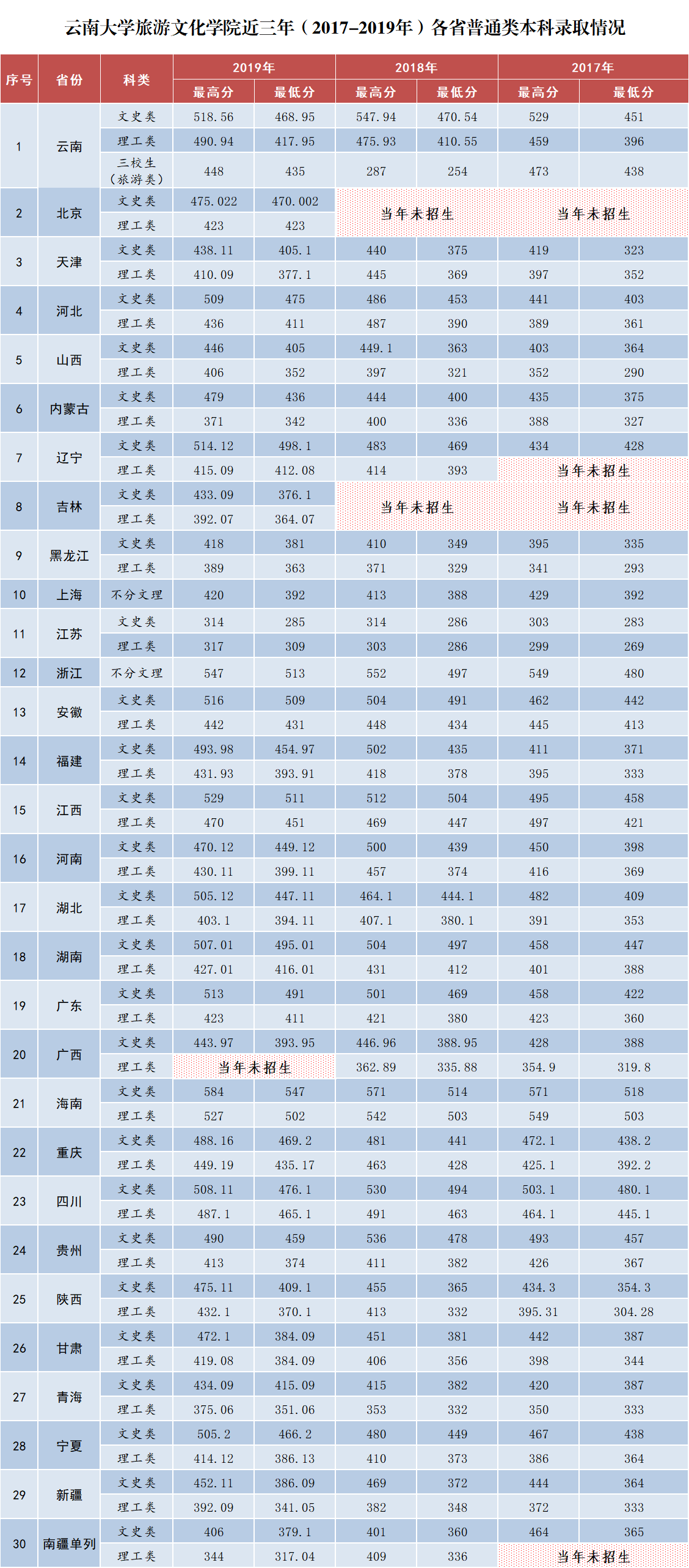 云南大學旅游文化學院2017-2019年普通類本科各省錄取分數(shù)情況對比