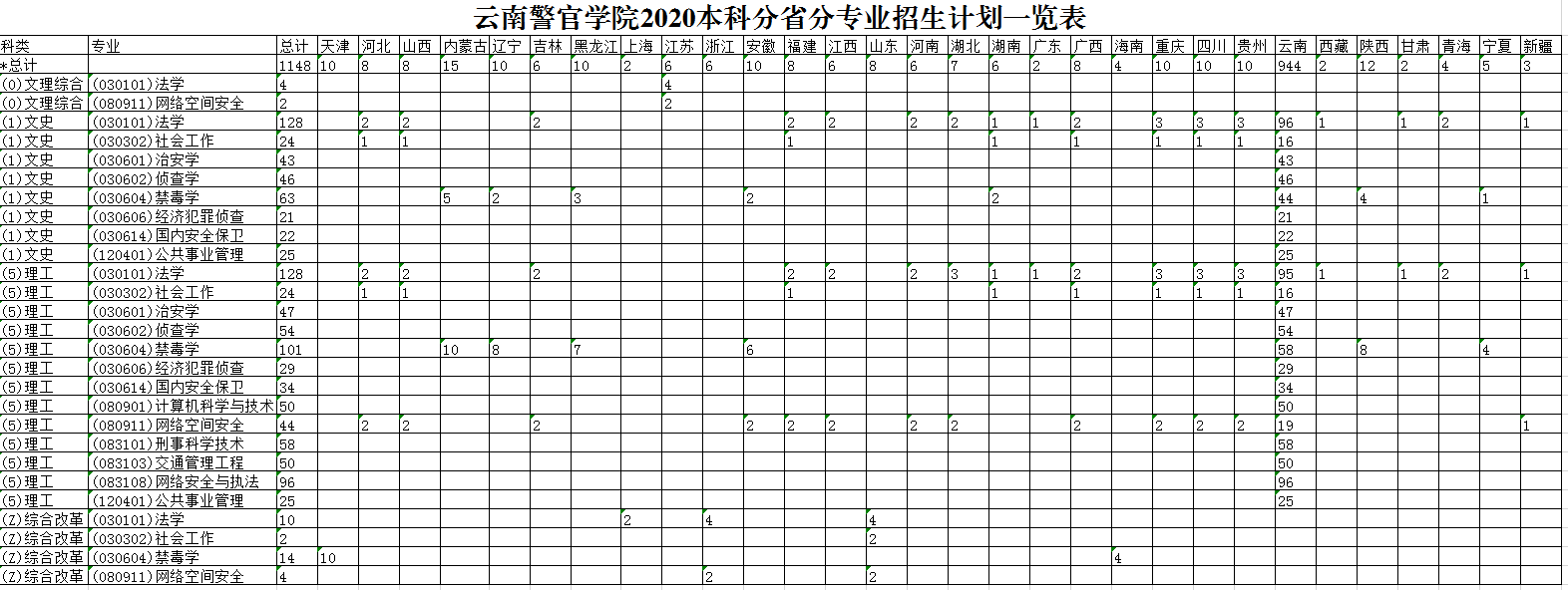 云南警官學院2020本科分省分專業(yè)招生計劃一覽表