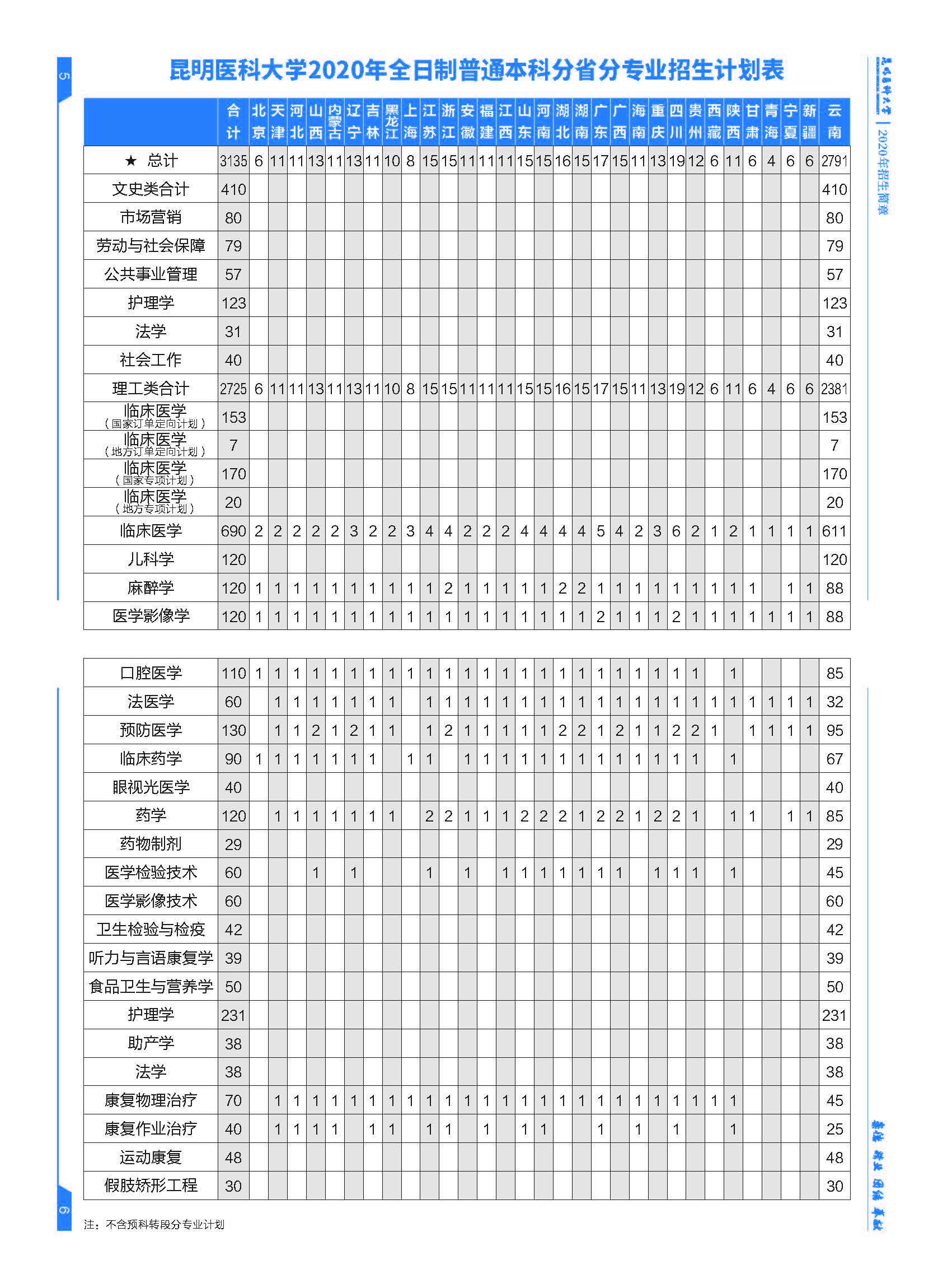 昆明醫(yī)科大學(xué)2020年全日制普通本科分專業(yè)招生計劃表
