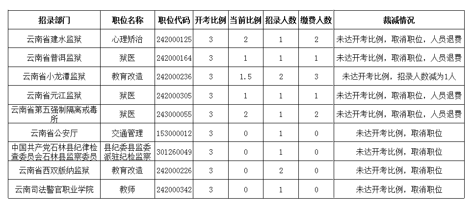 云南省2020年度考試錄用公務(wù)員報名資格審查及繳費工作已經(jīng)結(jié)束。根據(jù)《云南省2020年度考試錄用公務(wù)員公告》有關(guān)公共科目筆試開考比例規(guī)定,對實際繳費人數(shù)與計劃招錄人數(shù)比例未達(dá)到開考比例的招錄職位計劃予以裁減或取消,截止至2020年7月19日24時繳費結(jié)束,結(jié)合各職位實際報名繳費情況,決定裁減1名職位計劃,取消9名職位計劃,對6名人員予以退費?,F(xiàn)將錄用計劃裁減及取消具體情況通告如下: