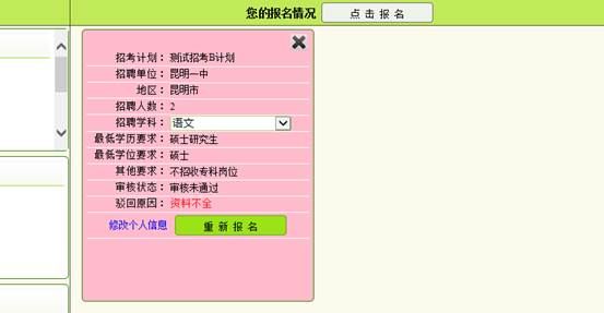 如果審核沒(méi)有通過(guò),需要查看駁回原因。此時(shí)可以根據(jù)駁回原因進(jìn)行修正,并選擇該計(jì)劃下的崗位進(jìn)行重新報(bào)名或者刪除該報(bào)名崗位,點(diǎn)擊“開(kāi)始報(bào)名”,重新報(bào)名該計(jì)劃或者其他計(jì)劃。