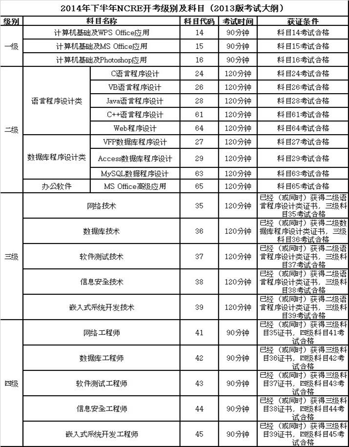 2、考試科目考核課程請到NCRE網(wǎng)站(www.ncre.cn)查詢,考試大綱均為2013版,考試教材均為高等教育出版社出版。