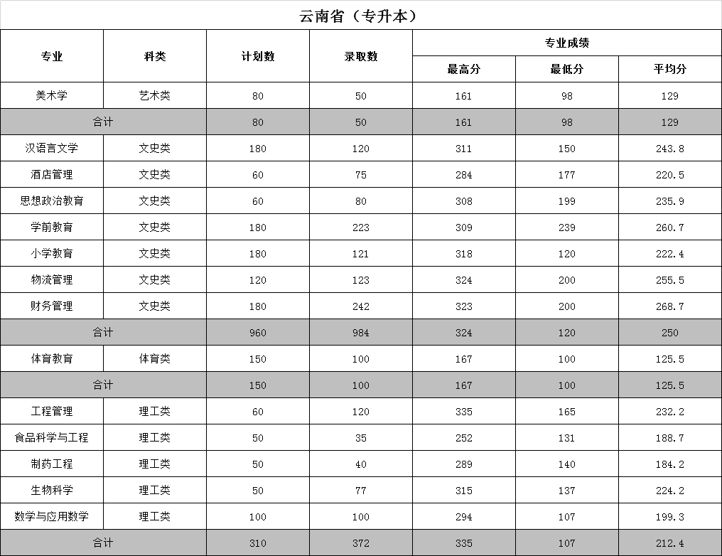 文山學院2020年招生錄取分數(shù)統(tǒng)計五(專升本)