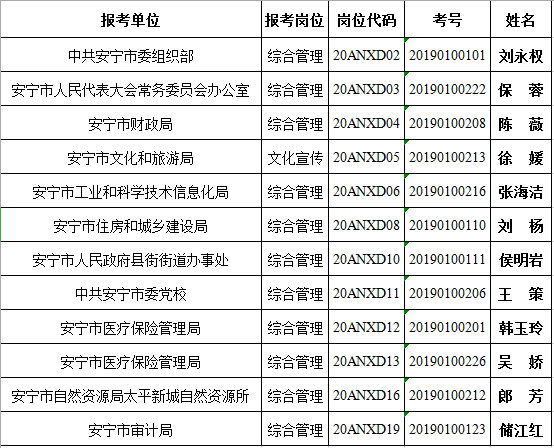 根據(jù)《云南省安寧市2020年市直單位(街道)面向市外公開(kāi)選調(diào)公務(wù)員(參公管理人員)公告》,劉永權(quán)等12名同志通過(guò)公開(kāi)報(bào)名、筆試、面試、資格復(fù)審、業(yè)績(jī)?cè)u(píng)價(jià)、體檢、考察程序,符合安寧市對(duì)外選調(diào)公務(wù)員的資格條件,現(xiàn)予以公示。