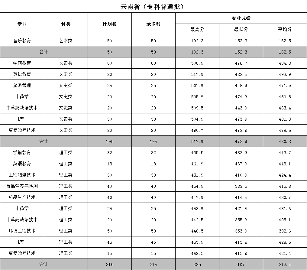 文山學(xué)院2020年招生錄取分?jǐn)?shù)統(tǒng)計六(云南專科普通批)
